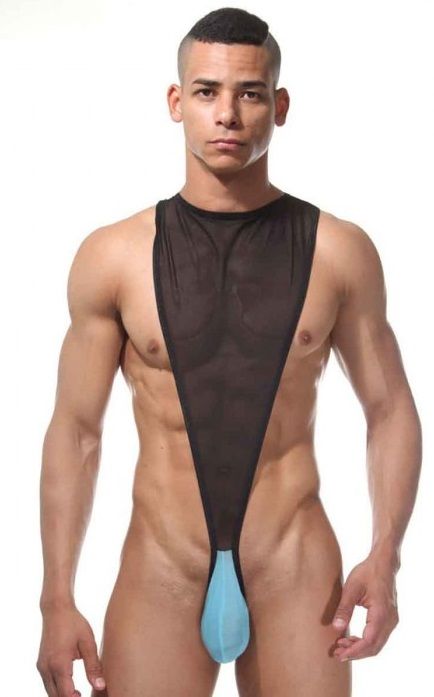 Оригинальное боди для мужчин, в котором скомбинирована верхняя полупрозрачная с контрастным гульфиком.