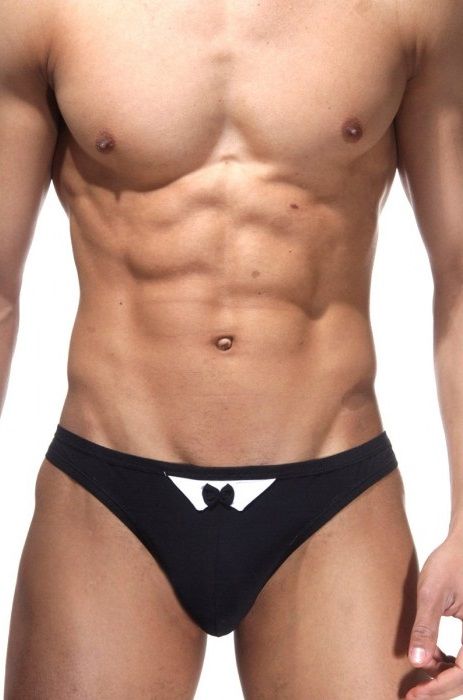 Классические трусы-стринги черного цвета. Спереди небольшая вставка белого цвета и маленький черный бант.