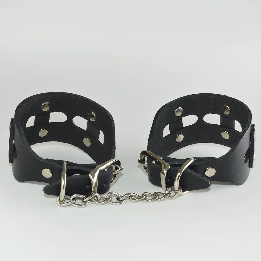Наручники изготовлены из натуральной кожи. Размер регулируется при помощи металлической пряжки. Наручники соединены цепочкой.