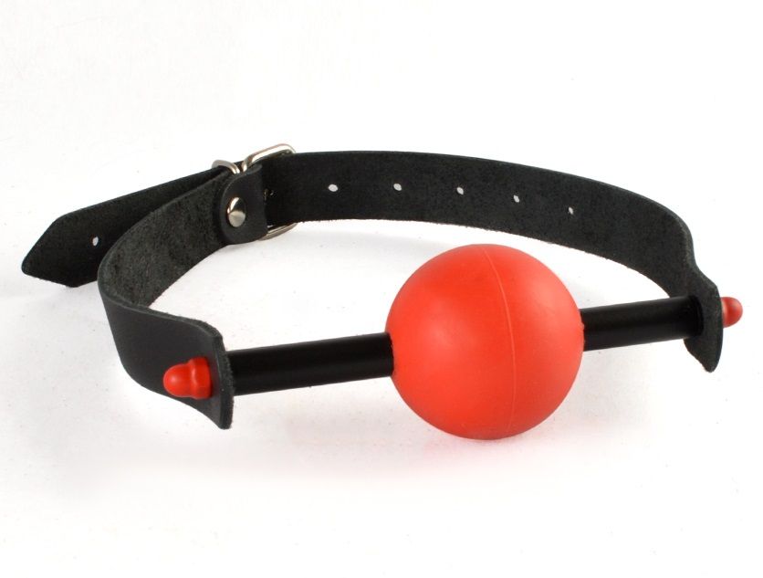 Кляп-шар изготовлен из термопластичного эластомера. Сфера удерживается металлической трубкой, к которой прикреплены ремешки из натуральной кожи. Кляп регулируется при помощи металлической пряжки. Размер универсальный. Диаметр шара - 4,5 см.