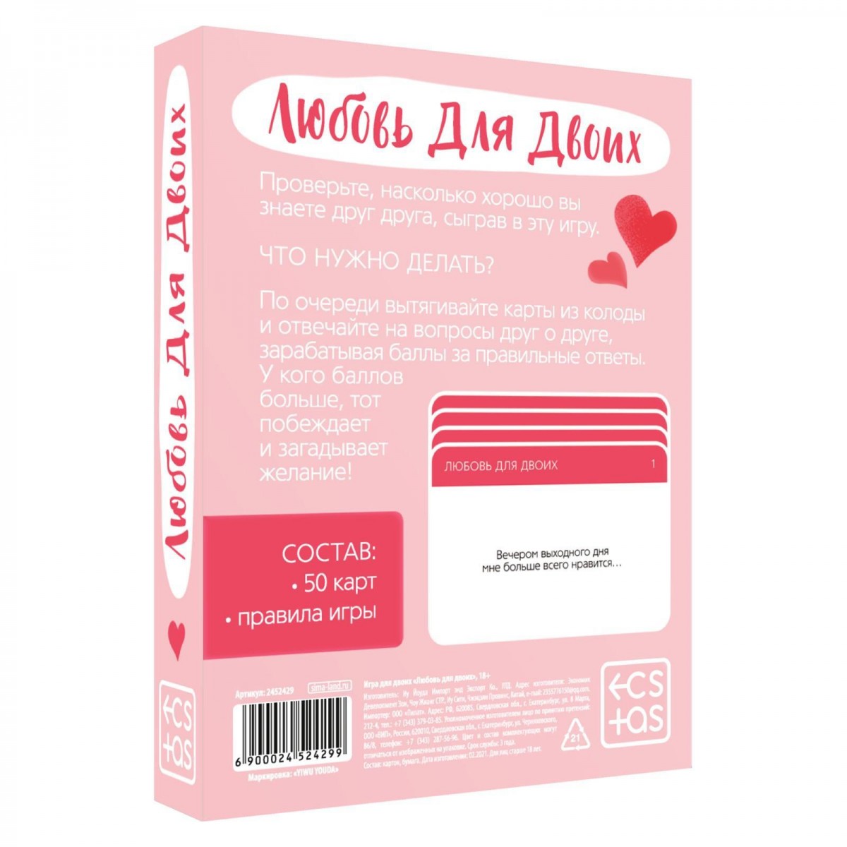 Романтическая игра для двоих. Отвечайте на вопросы о своей второй половинке, зарабатывайте баллы за правильные ответы и побеждайте. Узнайте друг о друге всё, и даже больше! В наборе: 50 карточек правила игры.